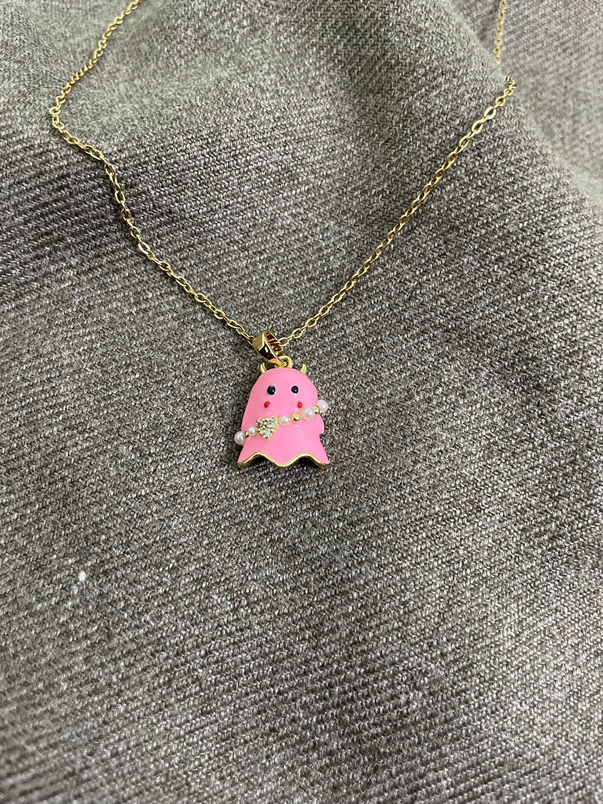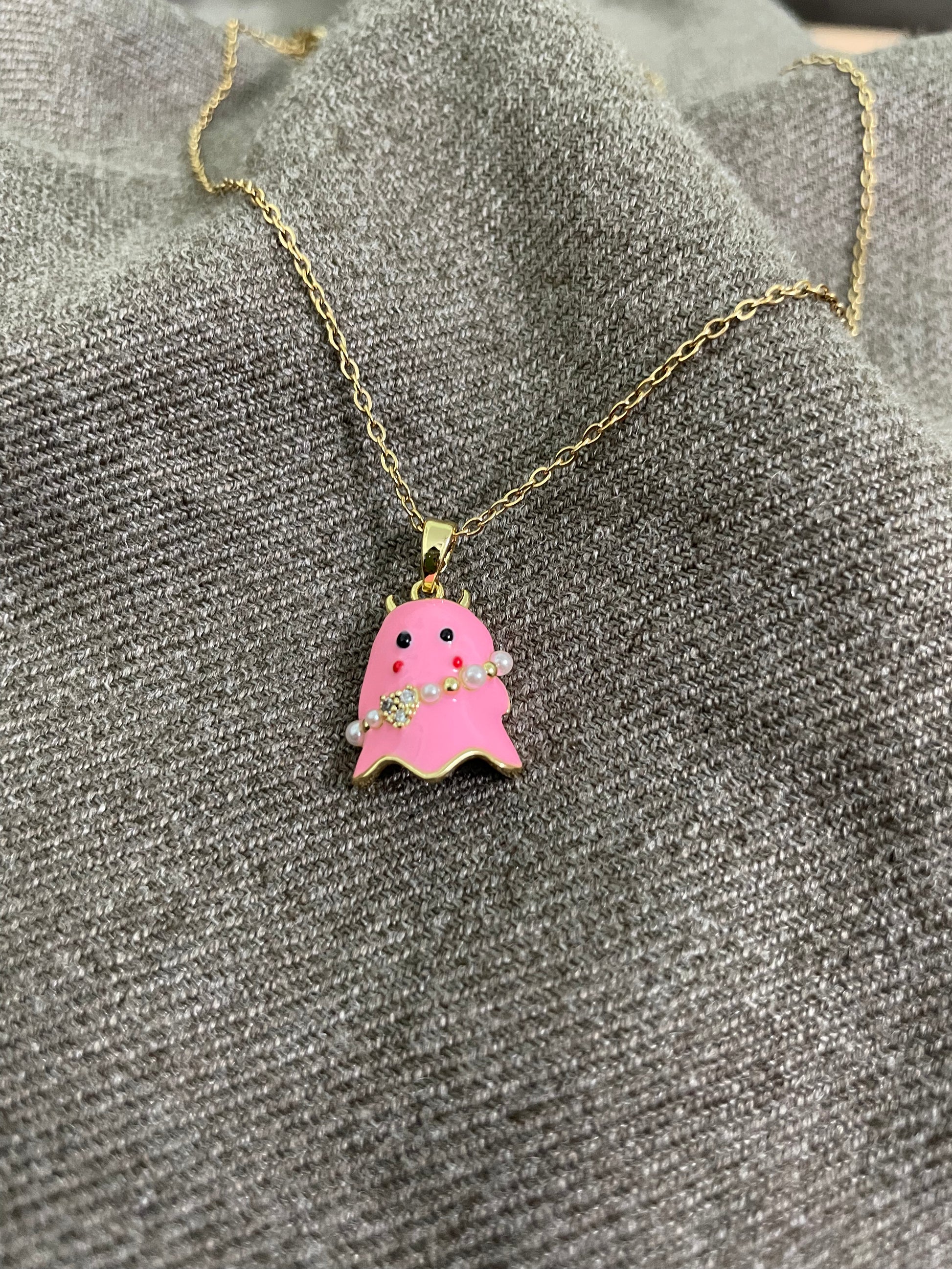 Add a quirky-cute touch to your style with the Pink Ghost Crystal Pendant Necklace, featuring an adorable pink ghost charm adorned with rhinestone and pearl detailing. Suspended from a dainty gold chain, this playful necklace is perfect for Halloween, themed parties, or making a fun statement in your everyday outfits. Lightweight and eye-catching, it's ideal for anyone who loves whimsical, character-inspired accessories.