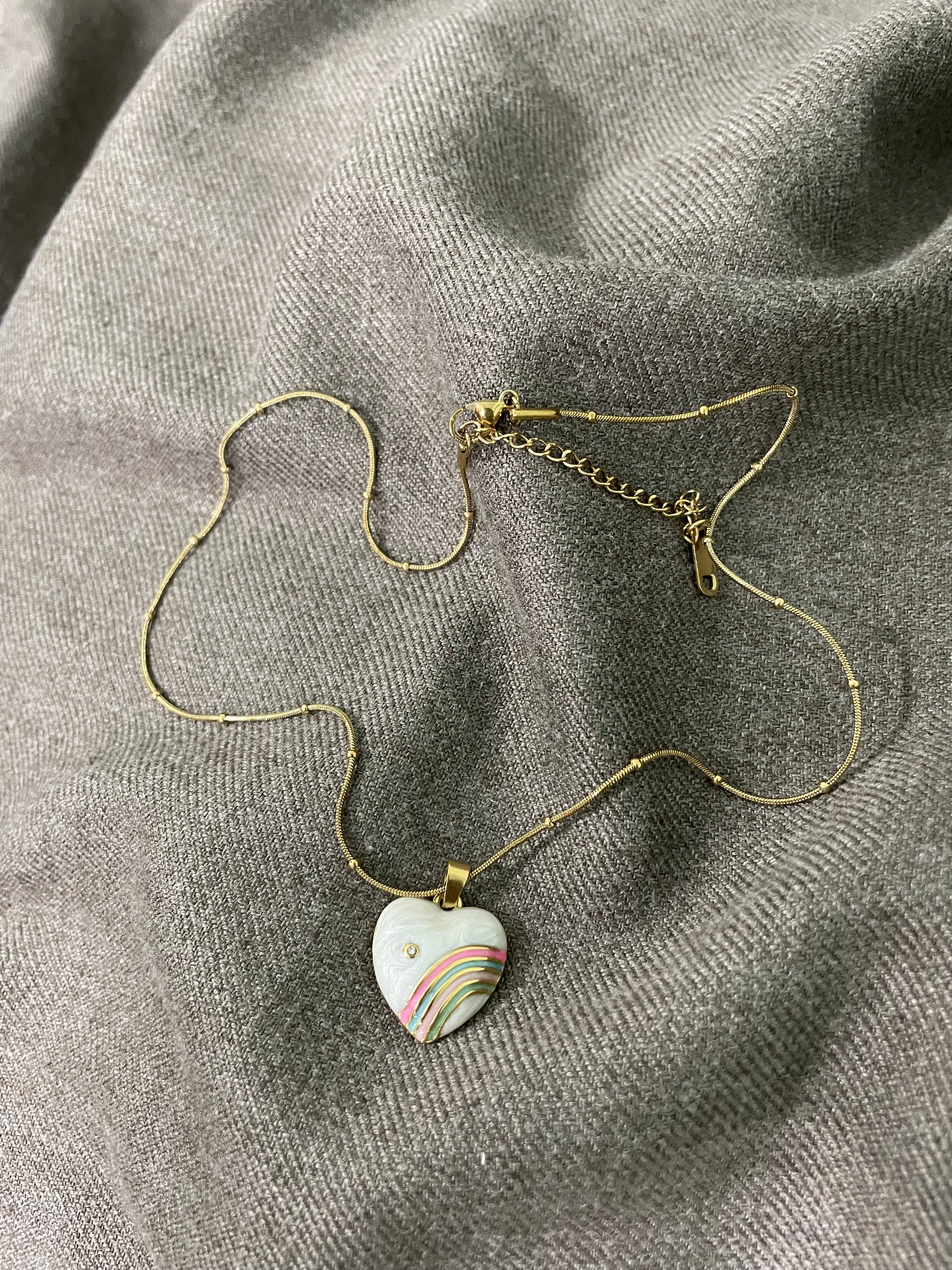 Brighten your style with the Rainbow Heart Beaded Necklace, featuring a charming heart-shaped pendant embellished with pastel rainbow stripes and a sparkling crystal accent. Suspended from a delicate beaded gold chain, this playful and whimsical accessory is perfect for both casual and festive occasions, adding a touch of joy and color to every outfit. Lightweight and cheerful, it's a sweet addition for those who love unique, heartfelt jewelry pieces.